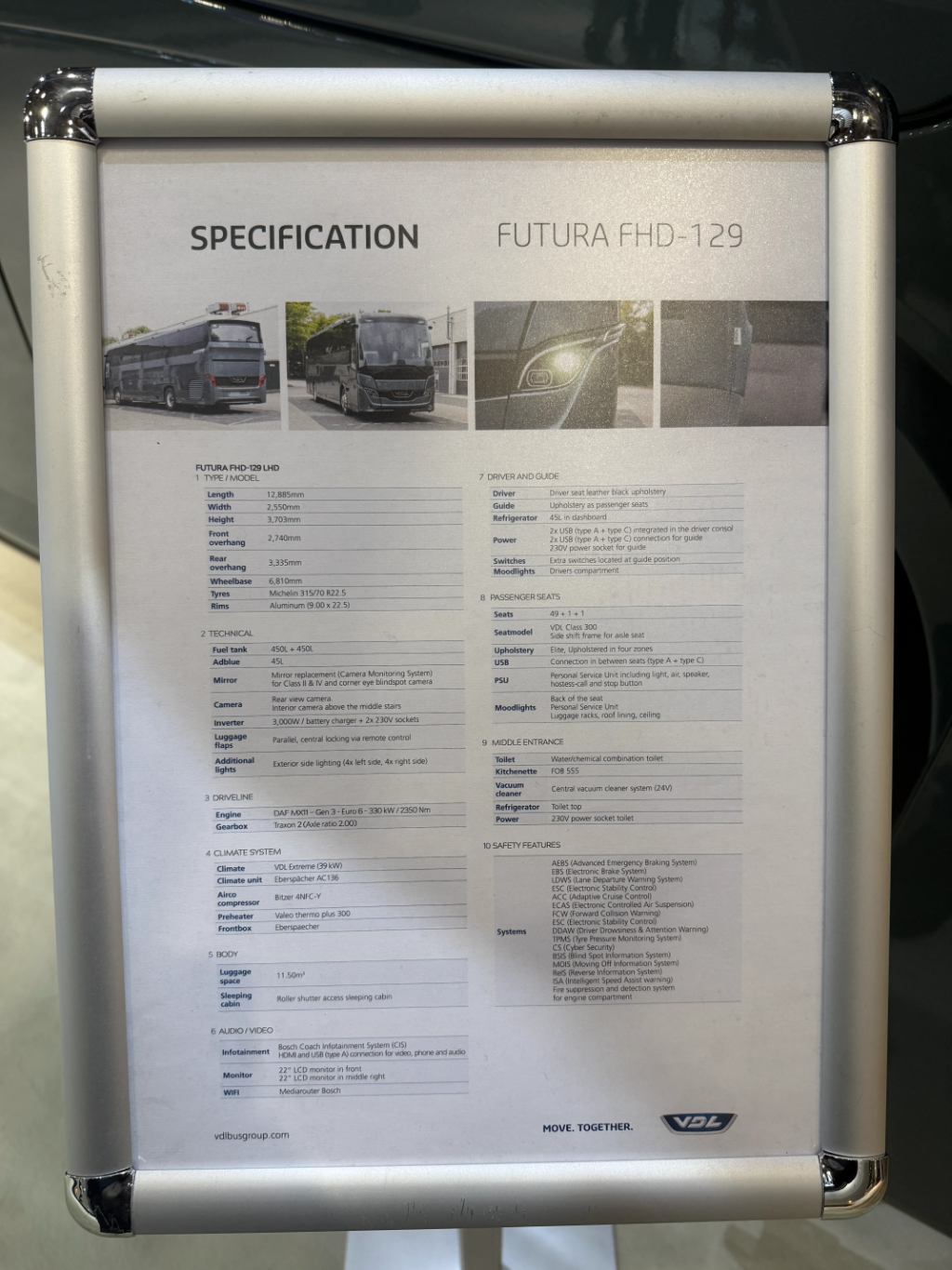 VDL Futura 3 predstavlja treću generaciju turističkog autobusa i centralnu tačku nastupa kompanije. Izložena su dva vozila dužine 12,9 m, širine 2,55 m i visine 3,7 m, sa 49 putničkih sedišta.