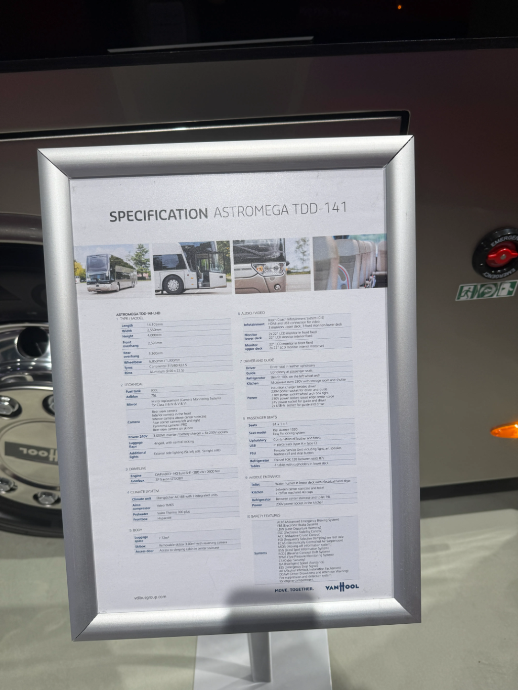 Dvospratni turistički autobus dužine 14,1 m i visine 4 m, sa 81 sedištem (Kiel Avance 1020). Pogon čini DAF MX13 NG Euro 6 E motor snage 390 kW, uz ZF TraXon menjač.