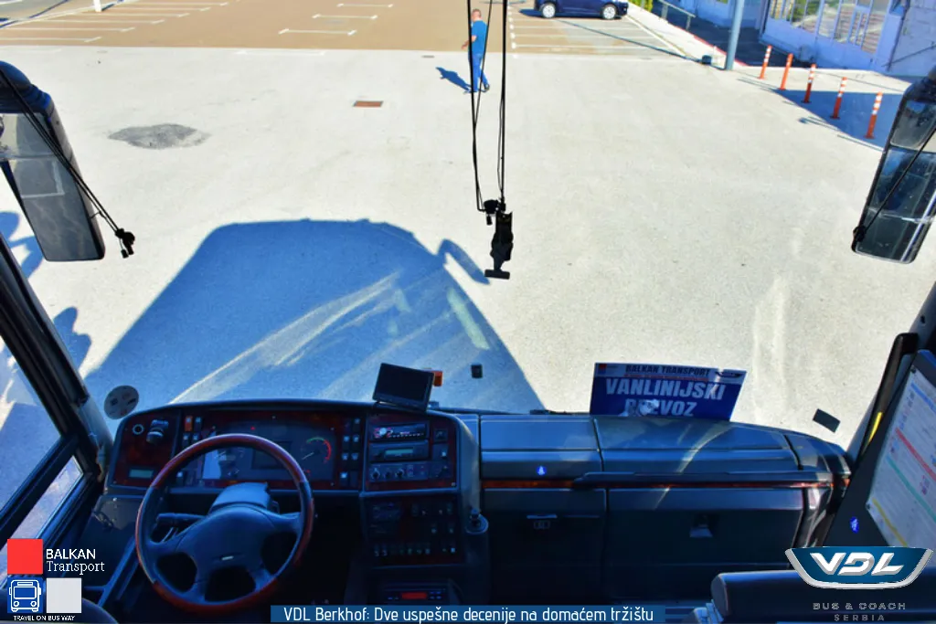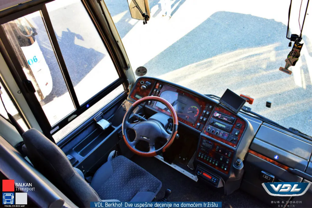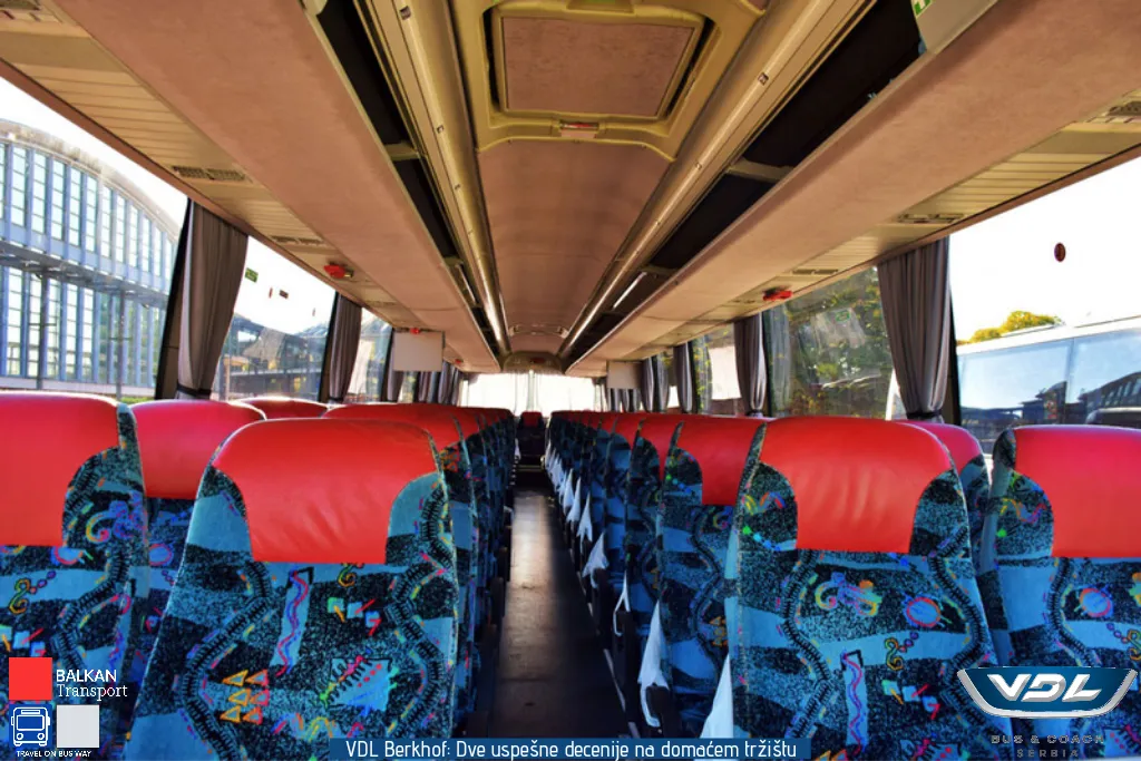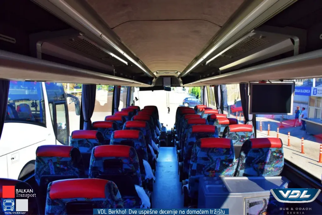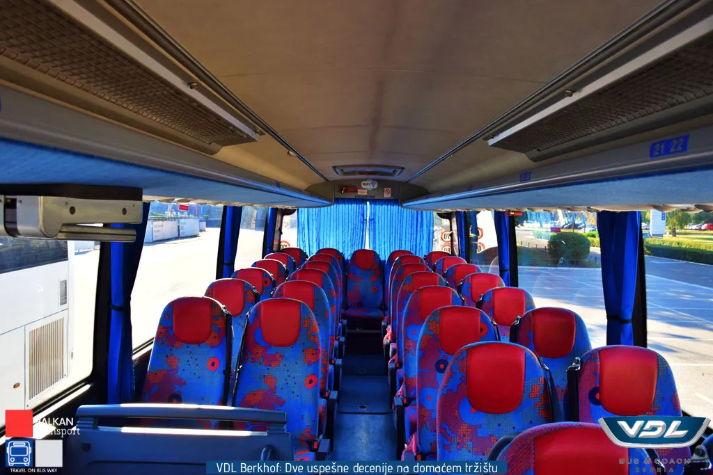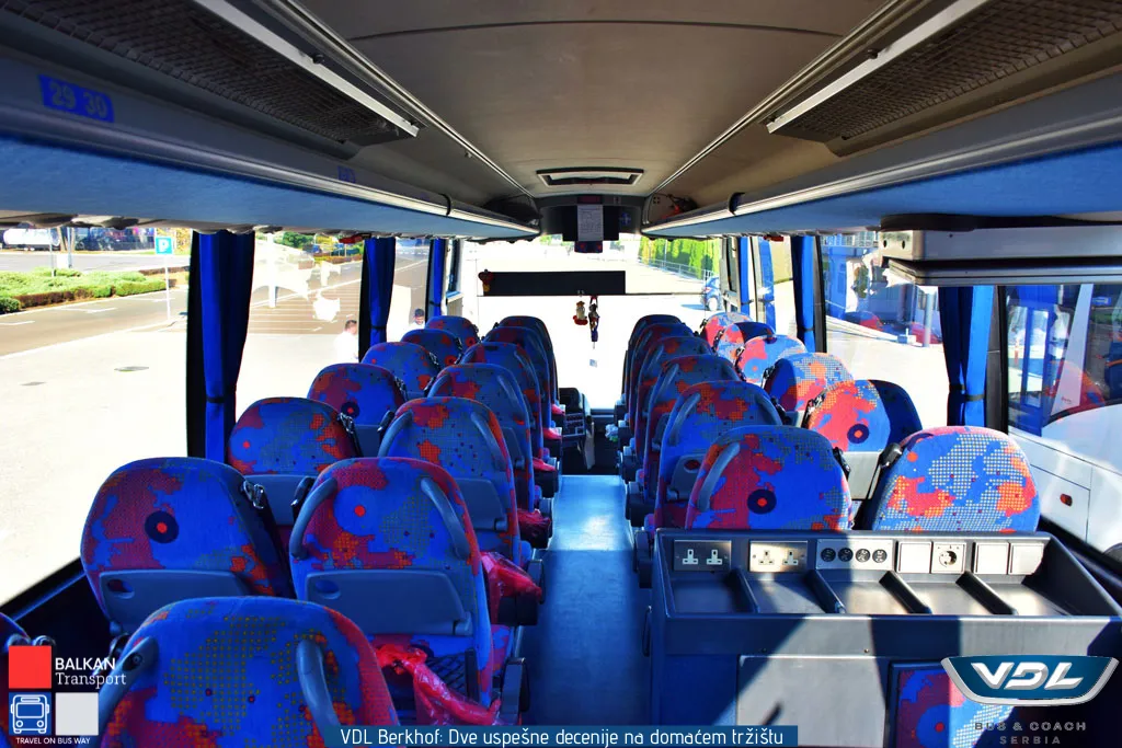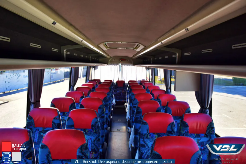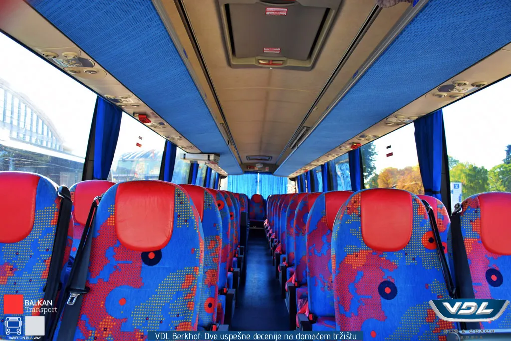 Ovaj VDL Berkhof opremljen je sedištima proizvođača Vogel. Sedišta imaju oboriv naslon, držače za noge kao i zaklopivi stočić. Vozilo poseduje 3 LCD monitora, kafe aparat, frižider, toalet i krevet za članove posade. Pored zadnje kamere, vozilo poseduje i bočnu kameru koja je pozicionirana iznad prednjih vrata.