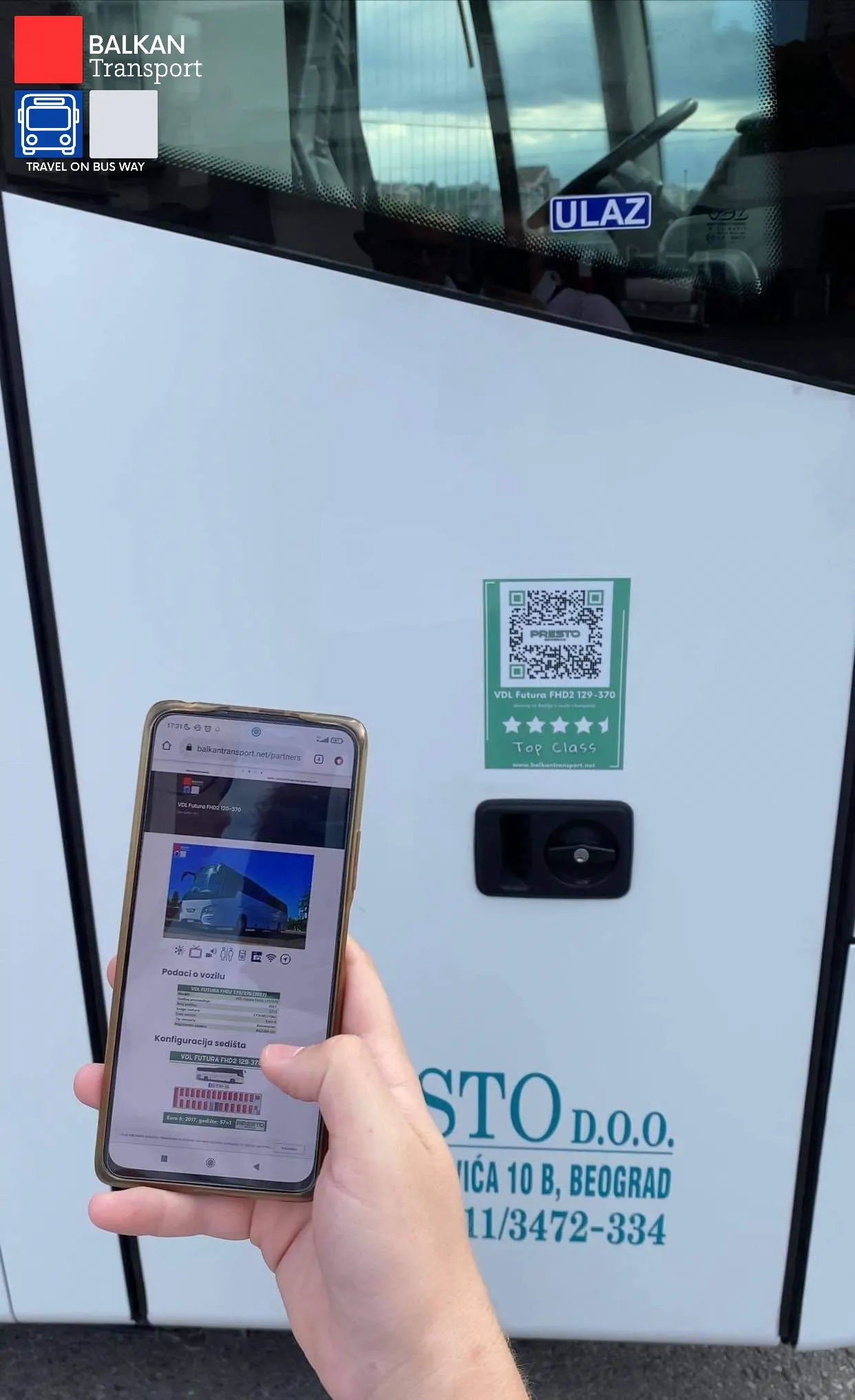Prvi ponosni partner sa kojim je na ovom polju ostvarena saradnja je kompanija Presto iz Beograda. Dve sjajne VDL Future koje su nedavno upotpunile vozni park kompanije svrstane su u Top Class-u i kategorizovane sa visoke 4.5 zvezdice. Pored standardizacije, ova dva vozila kompanije Presto dobila su i info stranice na našem sajtu.